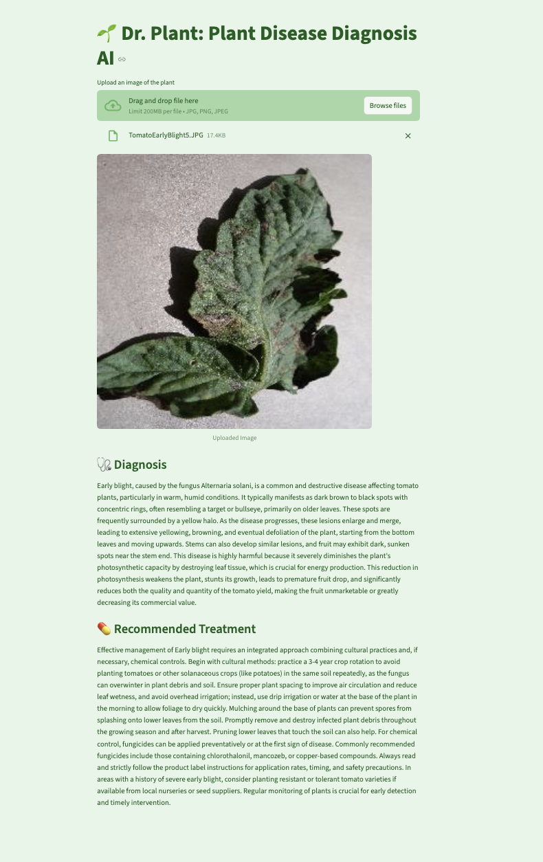 After identifying the disease, Dr. Plant queries Gemini to return a concise, user-friendly description and treatment plan (full implementation here). This integration allows responses to be tailored to each diagnosis in natural language.
